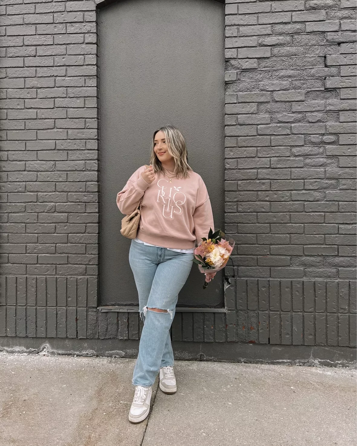 Casual look with oversized crewneck and jeans. Casual look with oversized crewneck and jeans.